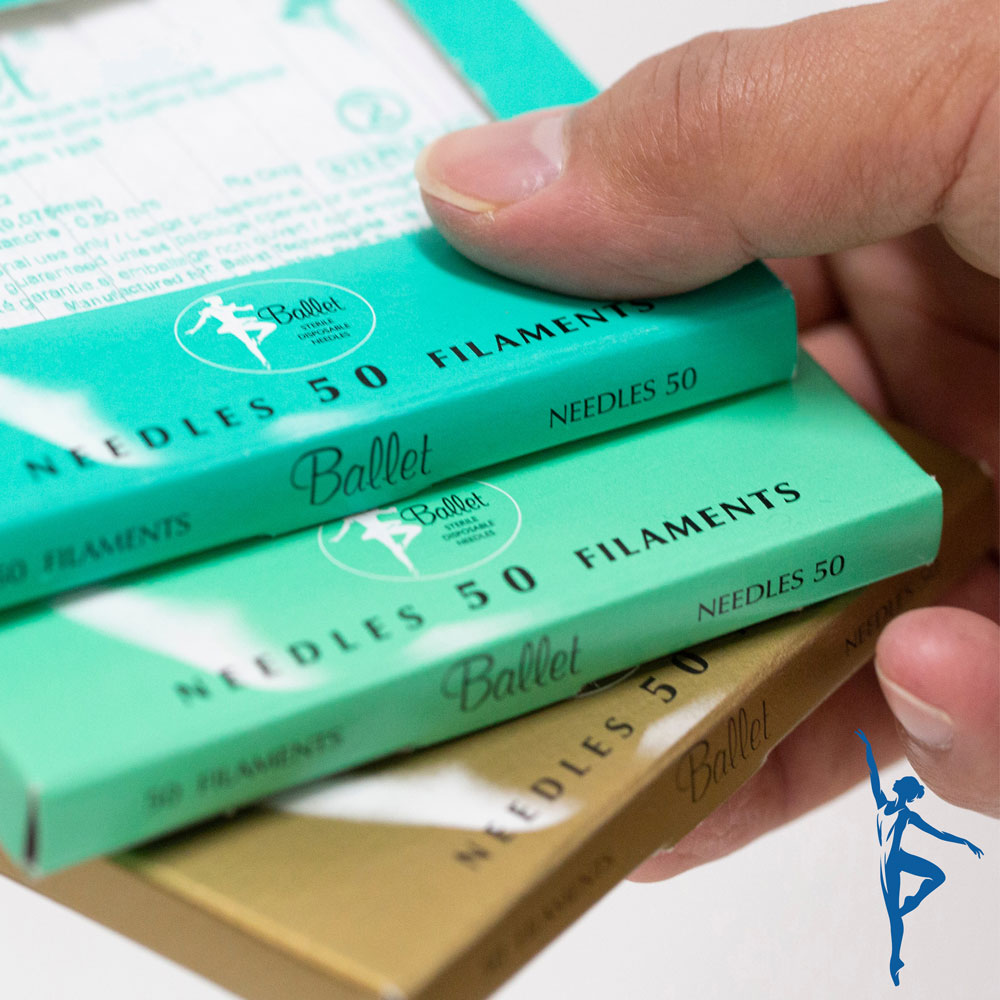 The Ballet insulated needle is coated with a medical-grade insulation less than one micron thick. This special coating, developed for use on dental prosthetics, allows smooth insertions and stands up to the longest treatments. Security from over-treatment is excellent. The sensitive surface layers of the skin are protected and important reductions of discomfort are possible.